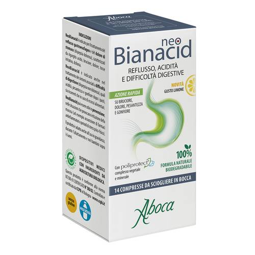 NeoBianacid è indicato per il trattamento del reflusso gastroesofageo e del dolore di stomaco (dispepsia dolorosa), caratterizzati da rigurgito acido, bruciore, dolore, tosse irritativa, disfonia.