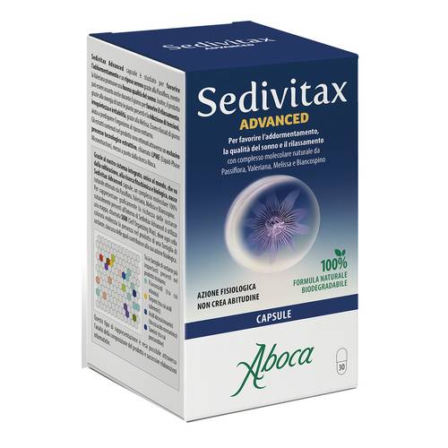 Sedivitax ADVANCEDDescrizione Integratore alimentare. Studiato per favorire l’addormentamento e un riposo sereno grazie alla passiflora, mentre la valeriana promuove una buona qualità del sonno. Inoltre, il prodotto può essere assunto anche durante il giorno per favorire il rilassamento, grazie alla sinergia di tutte le piante presenti e la riduzione di tensioni, irrequietezza e irritabilità, grazie alla melissa. Essere rilassati di giorno aiuta a predisporre l’organismo al riposo notturno. Gli estratti contenuti nel prodotto sono ottenuti attraverso un esclusivo processo tecnologico estrattivo, chiamato LPME (Liquid-Phase Microe...