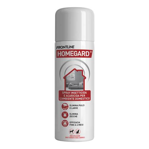 FRONTLINE HOMEGARD SPRAY INSETTICIDA E ACARICIDA PER L'AMBIENTE DOMESTICO Descrizione Spray in aerosol per il trattamento, in ambiente chiuso, dei mobili non lavabili e tessili per la casa come tappeti, stuoie e poltrone che elimina le pulci efficacemente e a lungo. Insetticida e acaricida ad azione rapida e a doppio spettro, uccide, dopo l’erogazione, pulci, larve di pulci e zecche. Efficacia residuale fino a 6 mesi dall’erogazione. Campi di applicazione: In ambiente chiuso. Trattamento mirato dei mobili non lavabili e tessili per la casa come tappeti, stuoie, poltrone. Organismi bersaglio (compresa la fase di sviluppo): ...